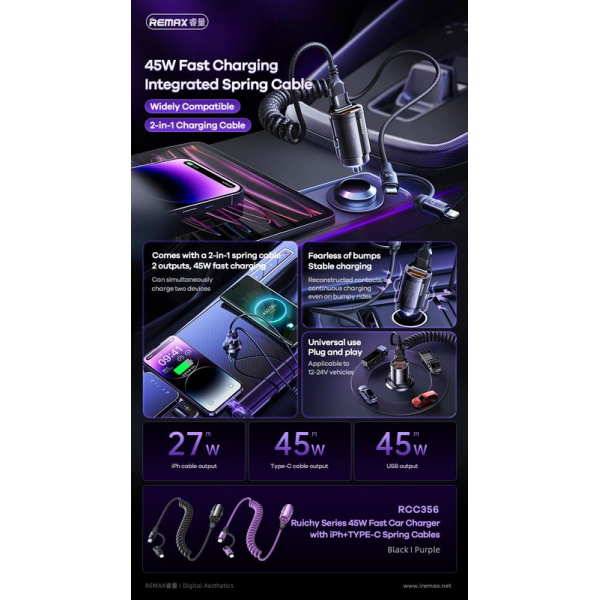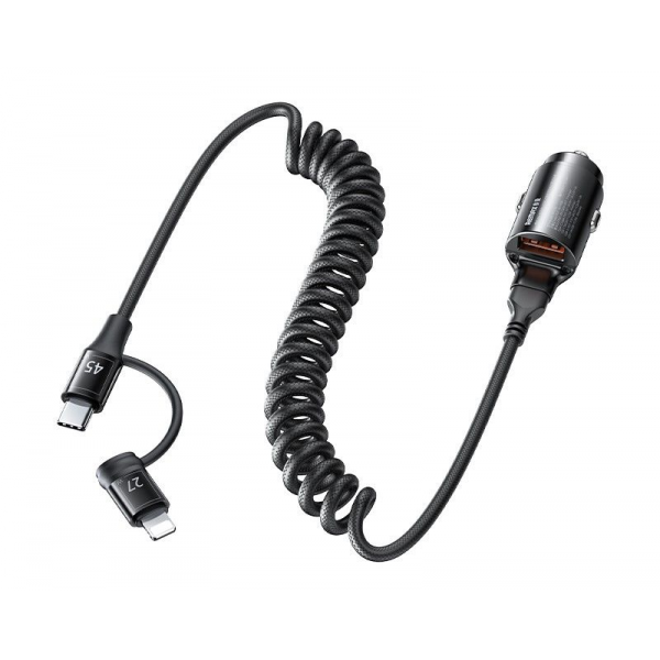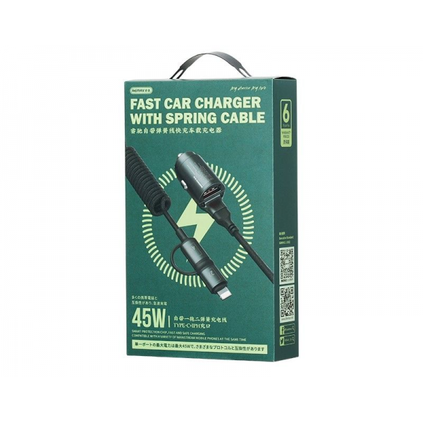 Remax RCC356 45W Car Charger 1xUSB-A + 1xUSB-C/Lightning Coiled Cable
