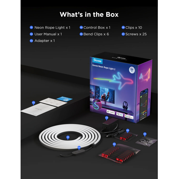Govee Neon Rope Light 2 Wi-Fi & Bluetooth Smart LED RGBIC (Multicolour) Strip 3m - White
