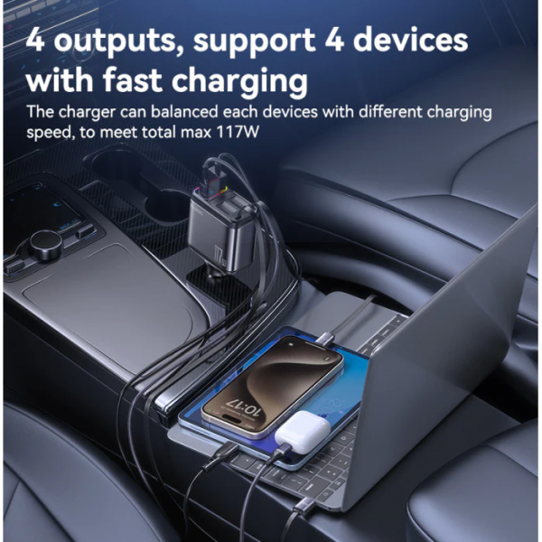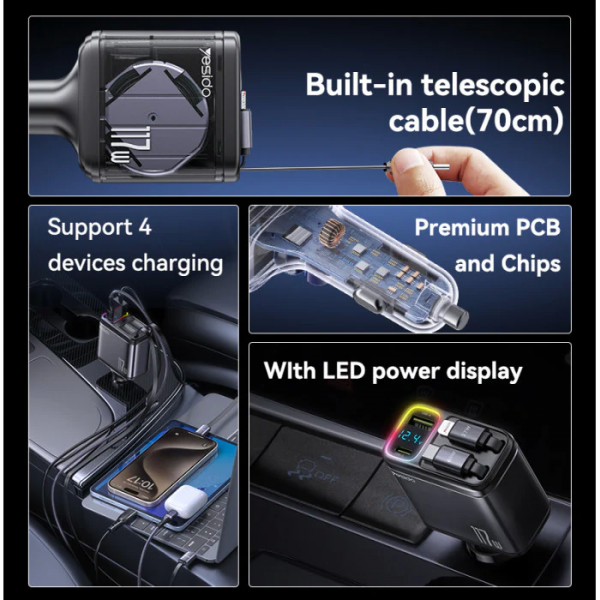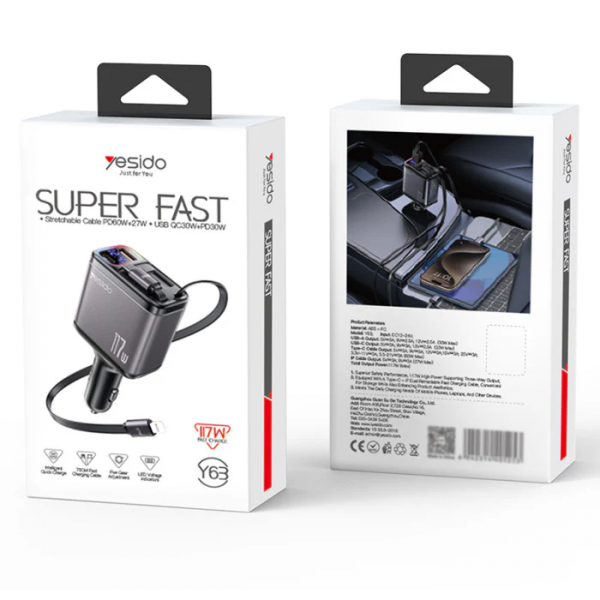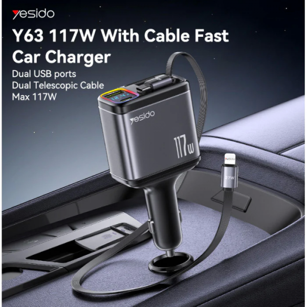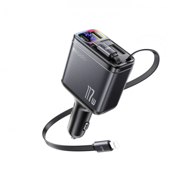 Yesido 117W USB Car Charger 1xUSB-C 1xUSB-A with Lightning and USB-C Cables